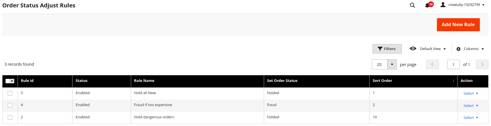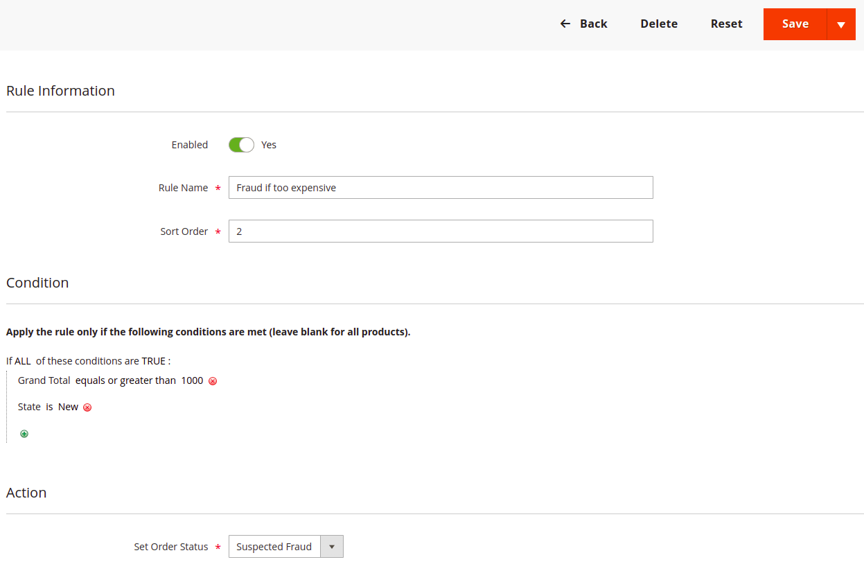 I created an example rule which will catch all orders that were just placed and their Grand Total is greater or equal to $1000.00. All such orders will be moved to “Suspected Fraud” status. State will be set automatically to one that is corresponding to status.