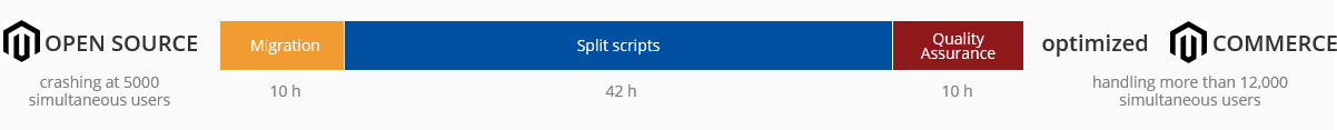 Migrating from the open source edition to Magento Commerce can be a lengthy process, taking approximately a few months on average. The Creatuity team managed to complete this project, successfully, in just 62 hours. Migrating to the Commerce version took 10 hours, preparing split scripts took 42 hours (including deployment and updating staging environment), and quality assurance took another 10 hours.